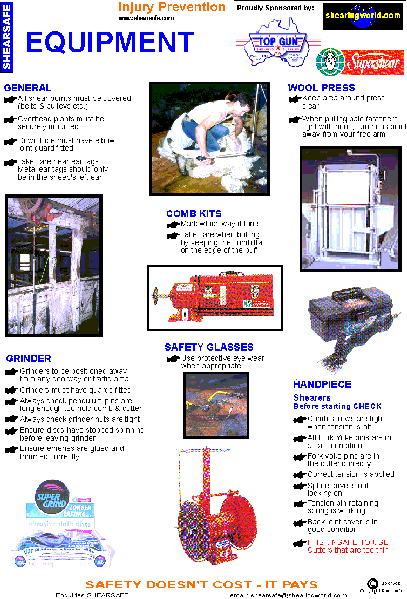 SHEARSAFE Injury prevention posters displayed in the workplace can educate and help everyone become more safety conscious All equipment needs to be safe, and the users need to be aware of hazards and document them. SHEARSAFE can assess how your current procedures compare to the industry requirements. Training will be conducted in areas where it is required, to ensure participants in the program are aware of their roles within the program, to create and keep a safer workplace for everyone.